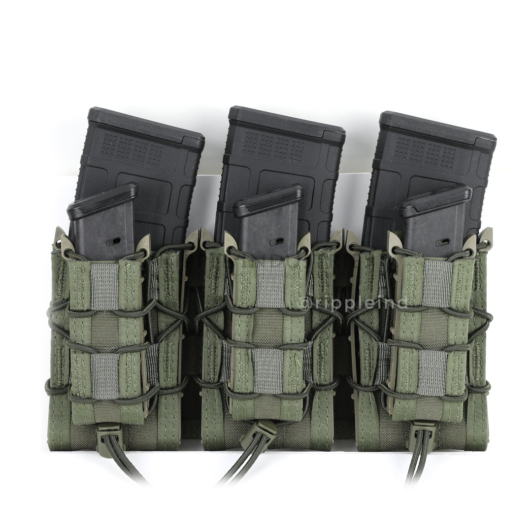 This MOLLE shingle will keep up to 3 rifle and 3 pistol magazines secure and readily available.  The three Double Decker pouches are permanently secured to a laser cut laminate base ensuring easy and stable mounting on any PALS platform, such as vests, plate carriers and battle belts.  Each Double Decker can hold almost any combination of magazines, HSGI Shot Shell Trays, flashlights, multitools and many other similar sized items.